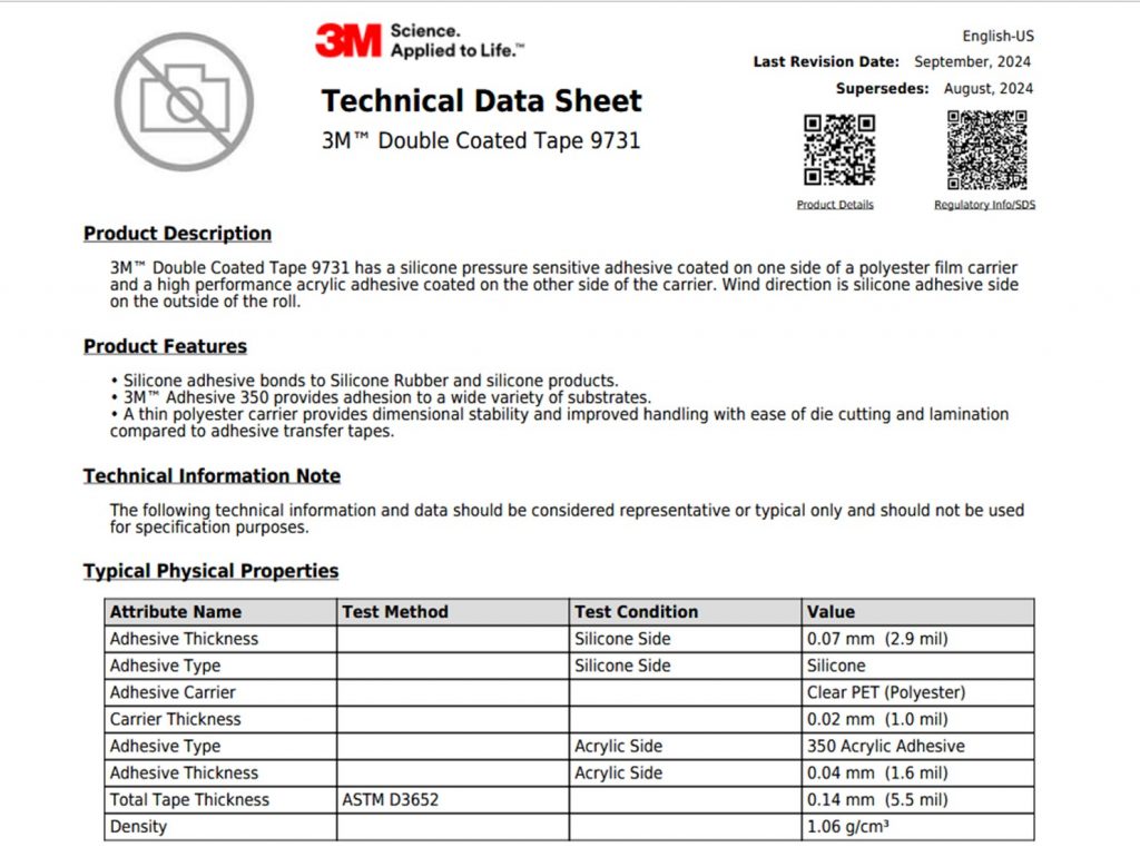 3M 9731: A dual-adhesive system with silicone adhesive on one side and high-performance acrylic adhesive on the other. This hybrid design allows bonding to silicone on one side while achieving stronger adhesion to metals, plastics, and other non-silicone substrates on the opposite side.