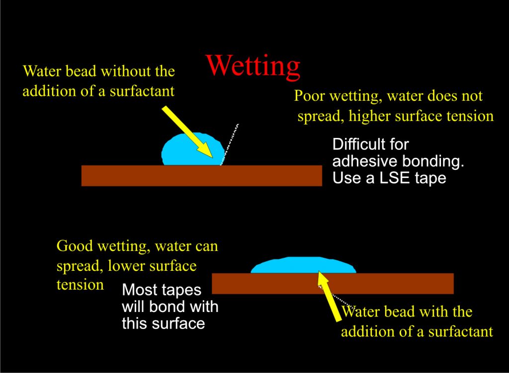 Pressure-sensitive adhesives (PSAs) bond by wetting out the surface. Some surfaces are more amenable to spreading out adhesive on its surface (meaning creating more and tighter contact with its surface). Oils, dust, silicone, or even light oxidation block intimate contact also prevent optimal wet-out. So knowing how well your material will reject (low surface tension) or promote wetting out (high surface tension), will be the first step in guiding you to the most appropriate adhesive tape for your application.